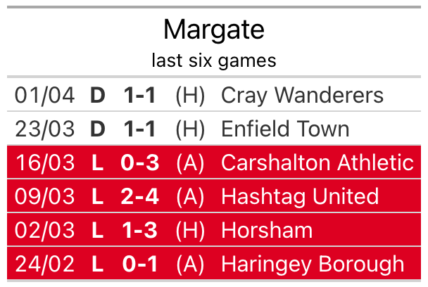 Margate are three places ahead of the hosts in 19th, with six wins and nine draws putting them on 27 points.
