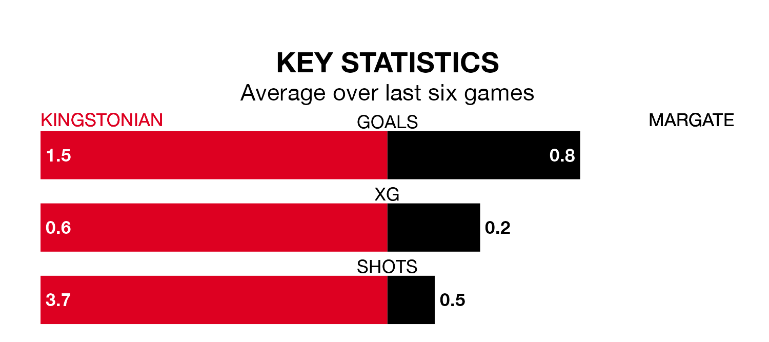 Kingstonian are also below average scorers, with 1.4 goals per game, compared to a league average of 1.6. They have conceded 2.4 goals per game.