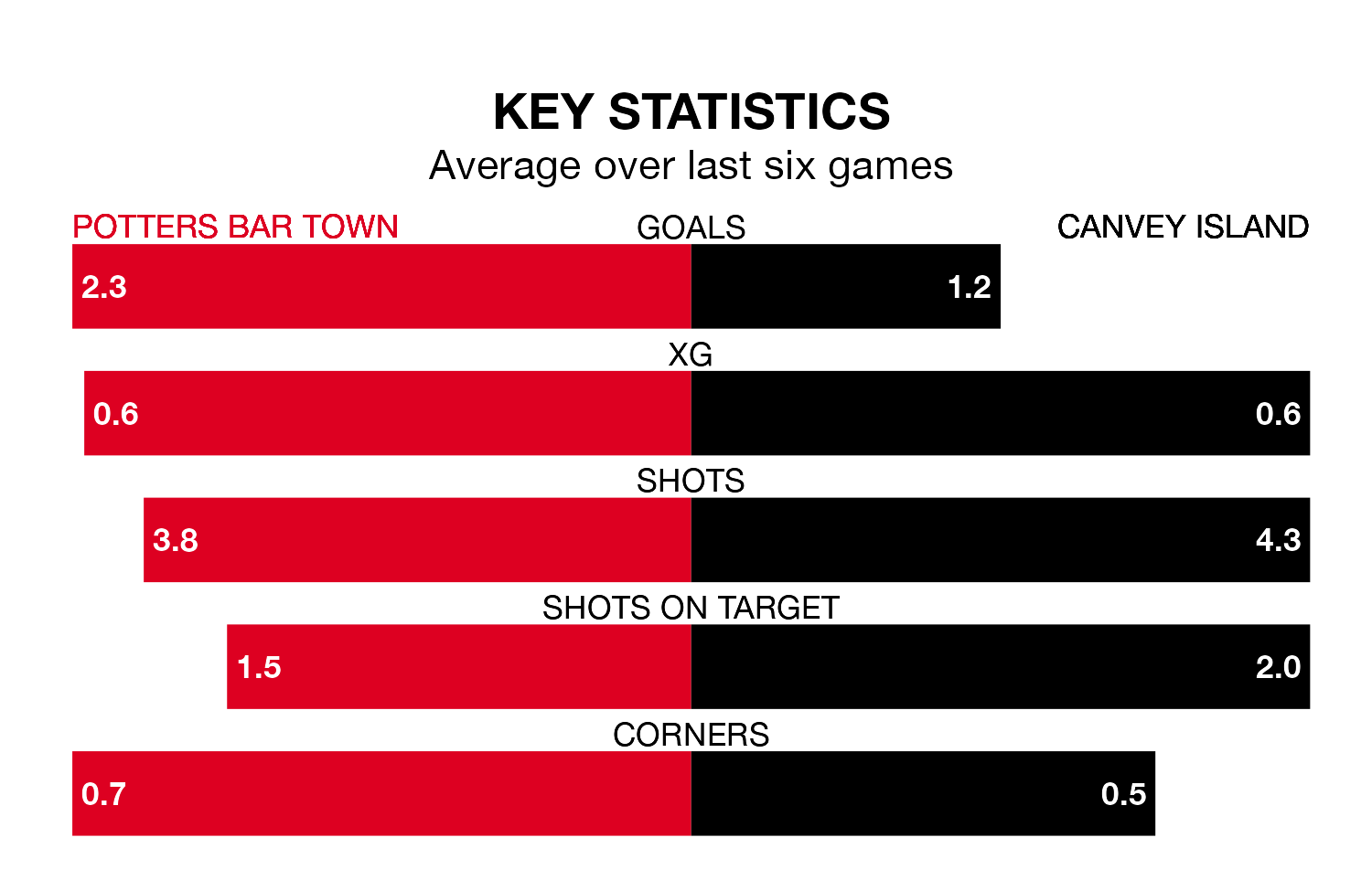 Canvey Island, meanwhile, are below average scorers, with 1.5 goals per game, compared to a league average of 1.6. They have conceded 1.9 goals per game.