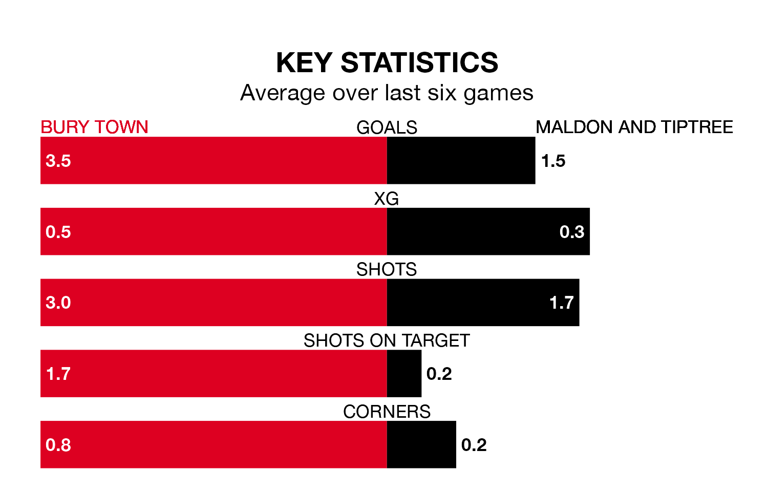 Maldon & Tiptree are also above average scorers, with 2.0 goals per game, compared to a league average of 1.7. They have conceded 1.6 goals per game.
