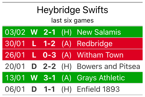 Heybridge Swifts’s last match was on February 3, a 2-1 win against New Salamis.
