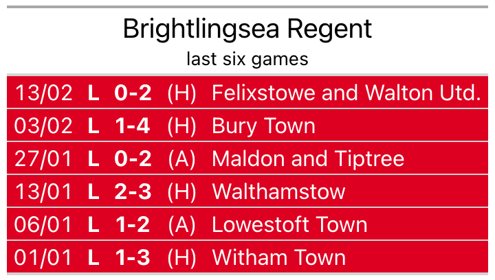 Brightlingsea Regent lost 2-0 against Felixstowe and Walton Utd. last time out, on February 13.