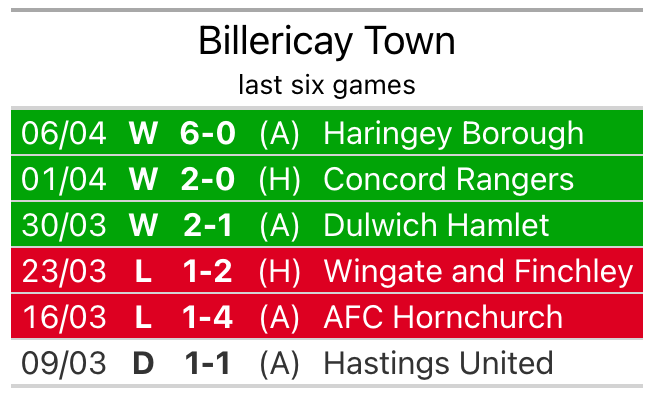Billericay’s last match was on April 6, a 6-0 win against Haringey Borough.