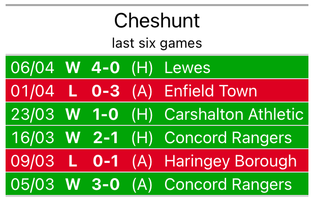 Cheshunt beat Lewes 4-0 last time out, also on April 6.