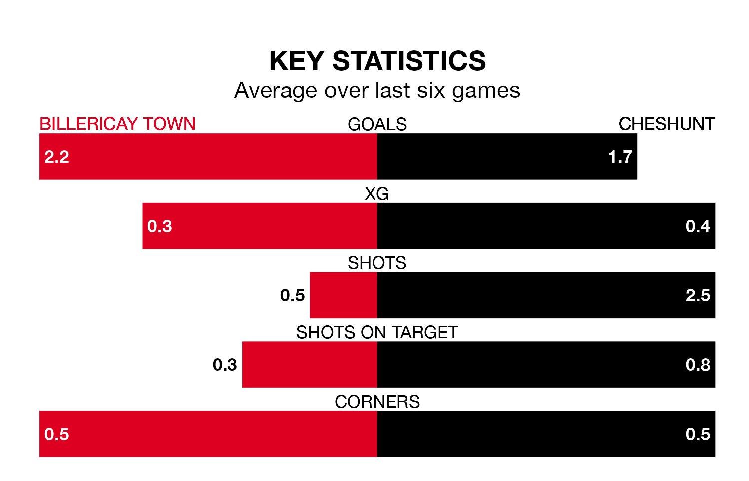 Billericay, meanwhile, are above average scorers, with 1.7 goals per game, compared to a league average of 1.6. They have conceded 1.2 goals per game.