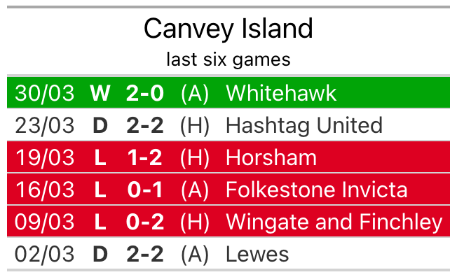 Canvey Island’s last match was on March 30, a 2-0 win against Whitehawk.