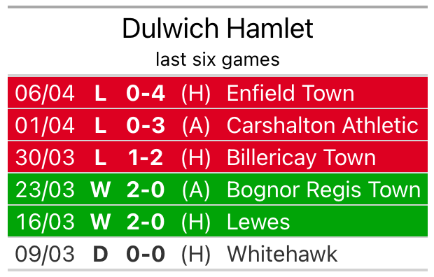 Dulwich Hamlet lost 4-0 against Enfield Town last time out, on April 6.