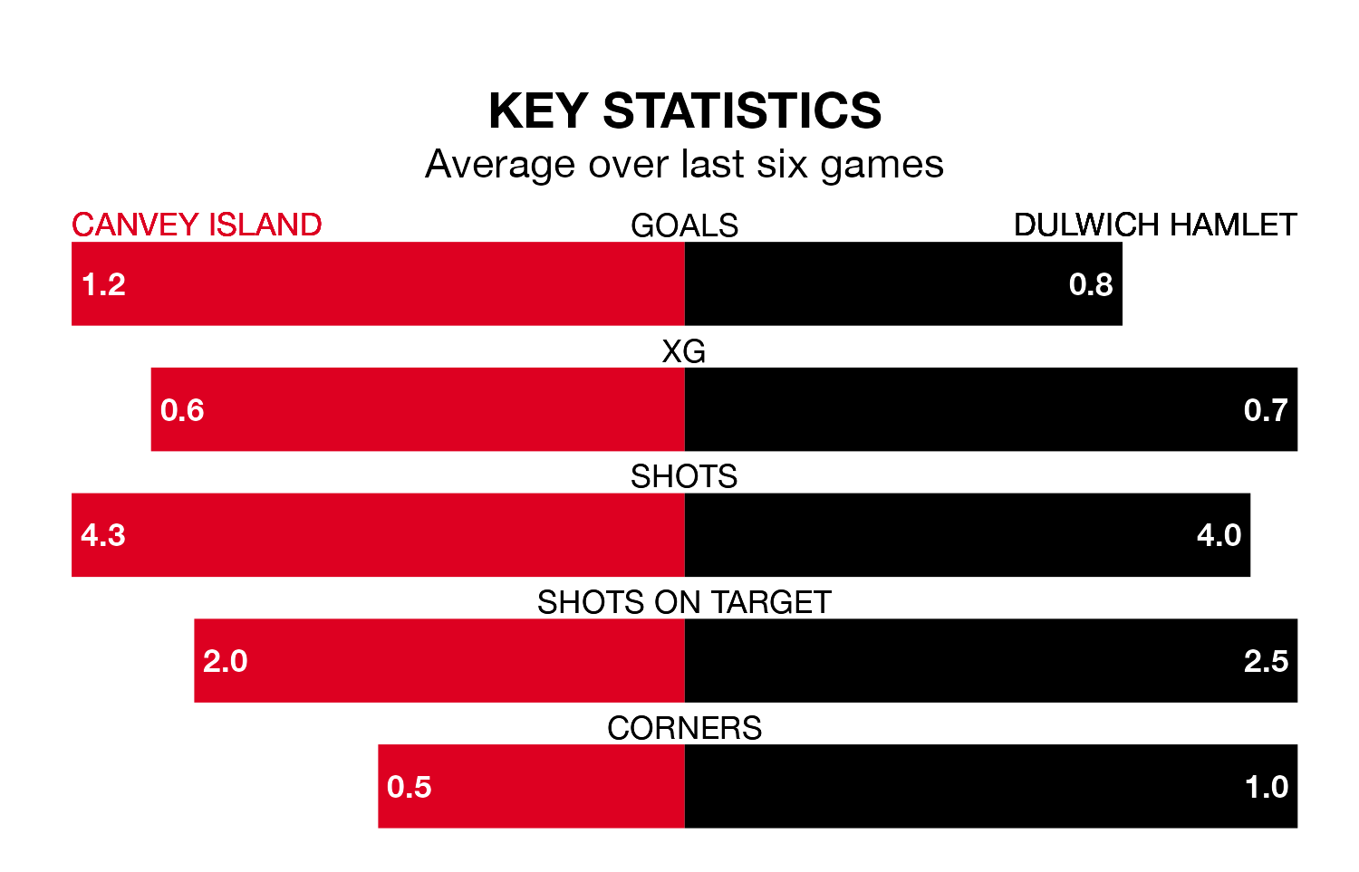 Canvey Island, meanwhile, are below average scorers, with 1.5 goals per game, compared to a league average of 1.6. They have conceded 1.9 goals per game.
