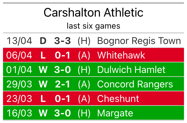 Carshalton’s last match was on April 13, a 3-3 draw against Bognor Regis Town.