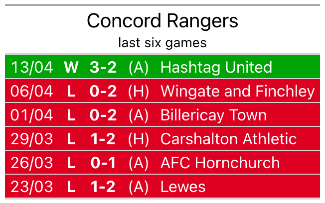 Concord are in bad form in the Isthmian Premier Division, with one win and five losses from their last six games.