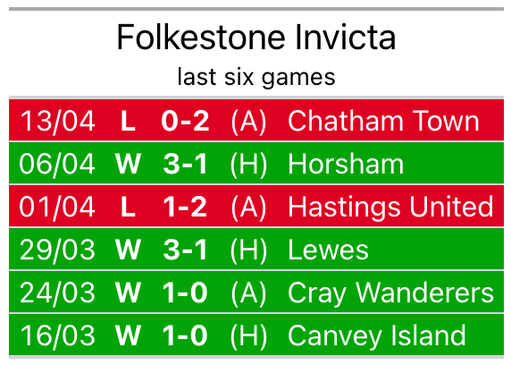 In their last league match, on April 13, Folkestone Invicta lost to Chatham Town 2-0 away.