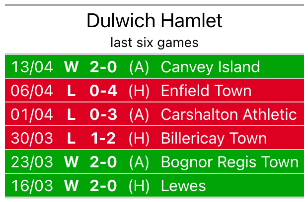 With three wins and three losses over that period, Dulwich Hamlet’s form is worse – they have taken nine points from 18, compared to the home team’s 12.