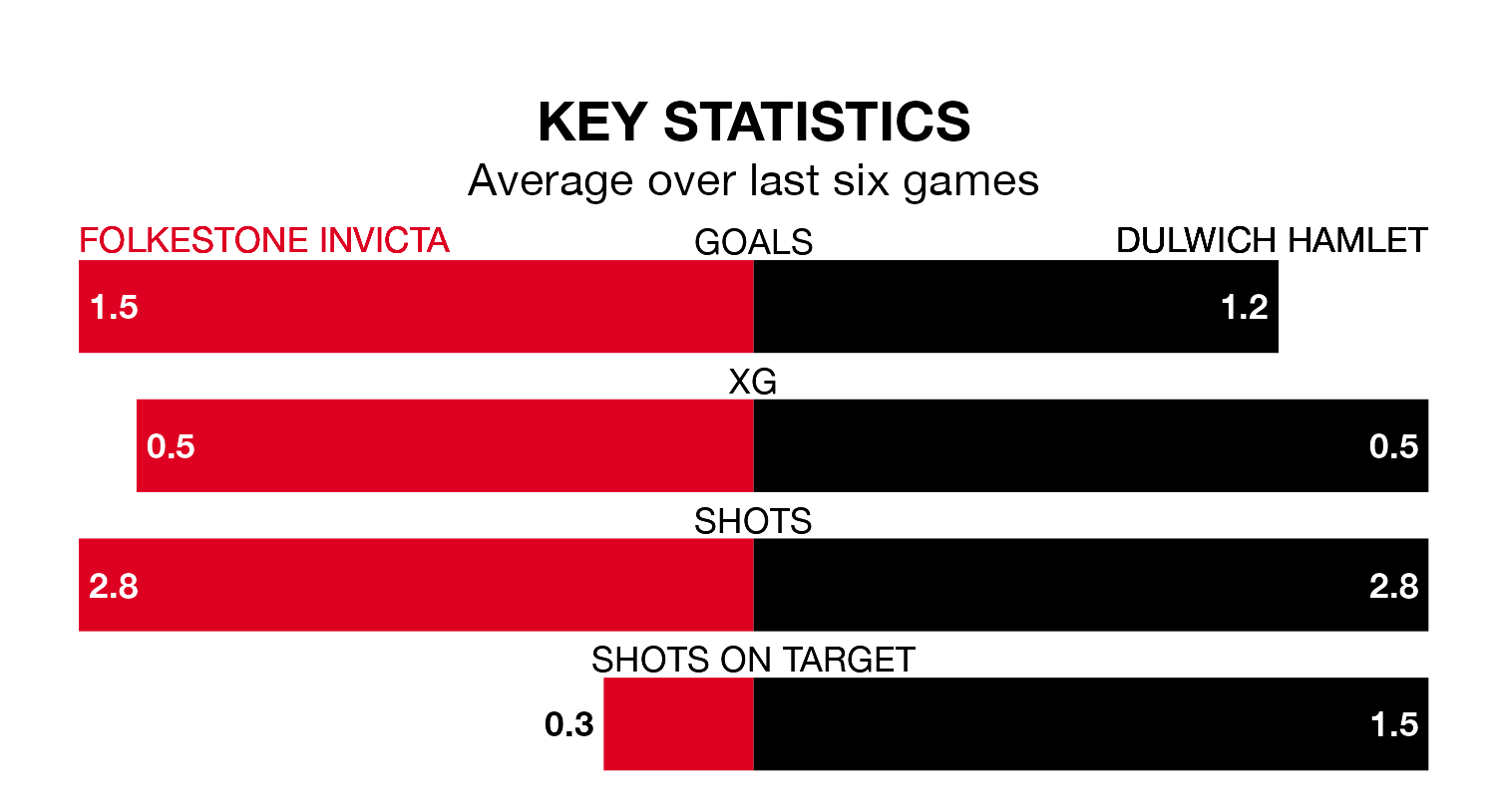 Folkestone Invicta, meanwhile, are below average scorers, with 1.4 goals per game, compared to a league average of 1.6. They have conceded 1.6 goals per game.