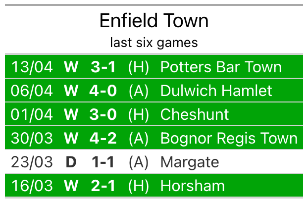 Enfield beat Potters Bar Town 3-1 last time out, also on April 13.