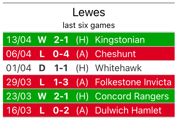 In their last league match, on April 13, Lewes beat Kingstonian 2-1 at home.