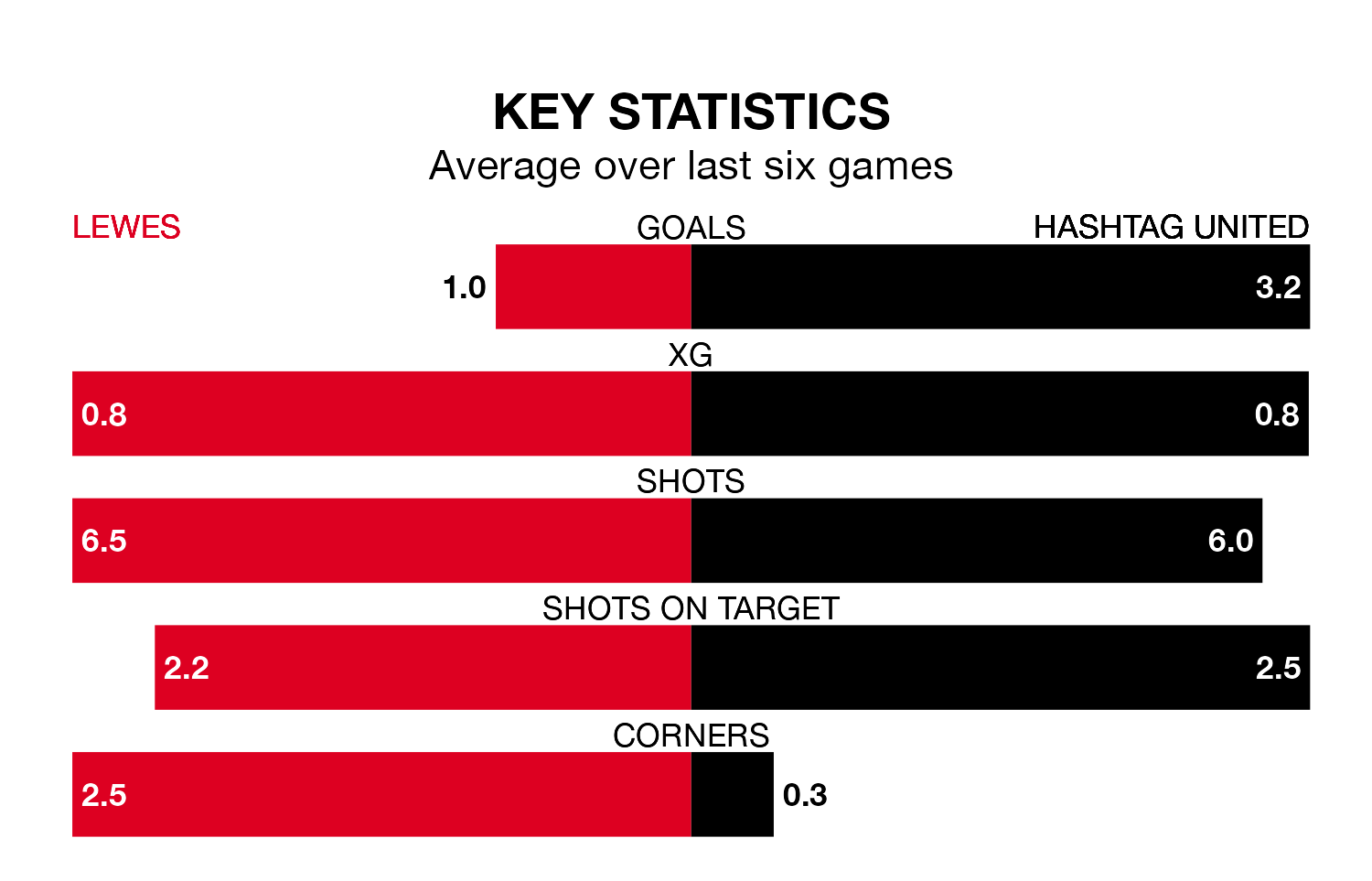 With three wins and a draw over that period, United’s form is better – they have taken 10 points from 18, compared to Lewes’s seven.