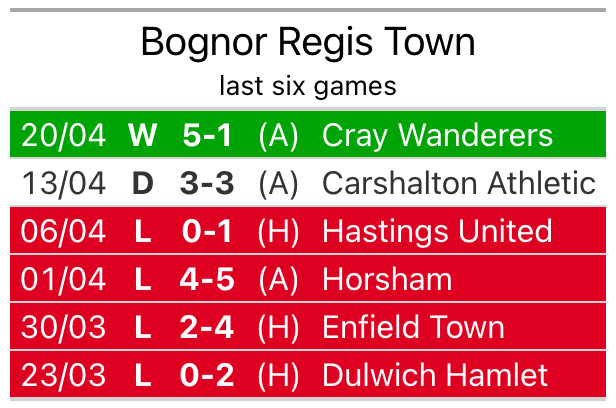 Bognor Regis’s last match was on April 20, a 5-1 win against Cray Wanderers.