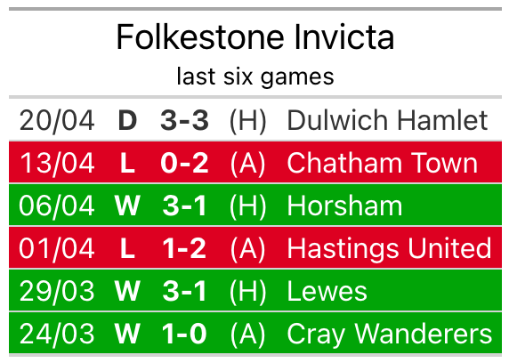 Folkestone Invicta drew 3-3 with Dulwich Hamlet last time out, also on April 20.