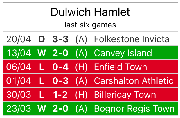 The visitors have drawn two and lost four of their last six fixtures, while Dulwich Hamlet have two wins and a draw.