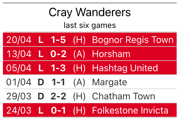 Cray lost 5-1 against Bognor Regis Town last time out, also on April 20.