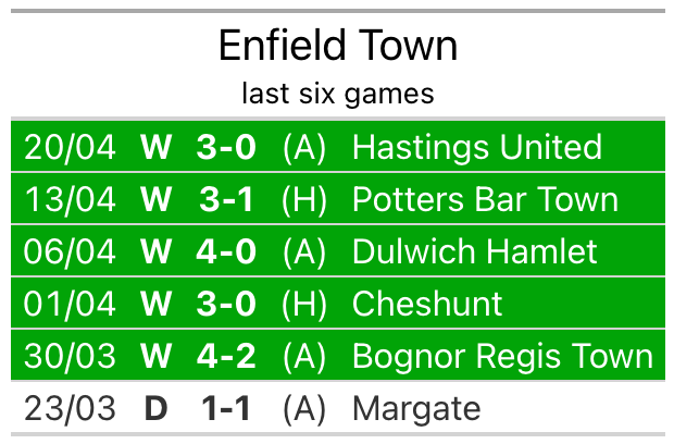 Enfield Town are in fantastic form in the Isthmian Premier Division, with five wins and a draw from their last six games.