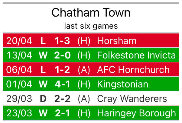 Chatham, who sit second in the league after 41 games, fell to a 3-1 home defeat to Horsham on April 20.
