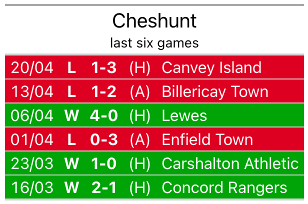 Cheshunt, meanwhile, are below average scorers, with 1.3 goals per game, compared to a league average of 1.6. They have conceded 1.7 goals per game.