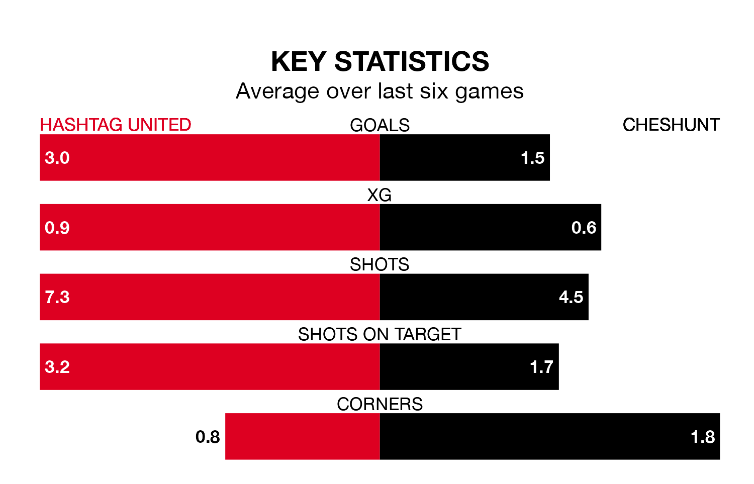 With three wins and three losses over that period, Cheshunt’s form is slightly worse – they have taken nine points from 18, compared to Hashtag’s 10.