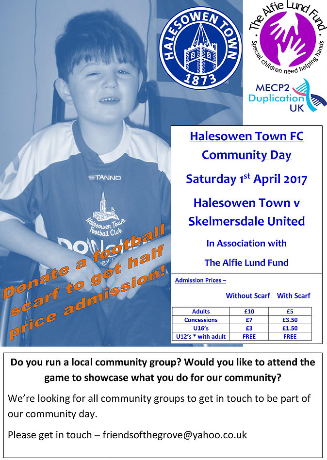 “If you are looking for a game to attend on April 1st come down to Halesowen, donate a scarf meet Alfie and watch affordable football for £5 and support a great cause.