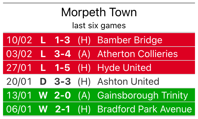 Morpeth lost 3-1 against Bamber Bridge last time out, also on February 10.