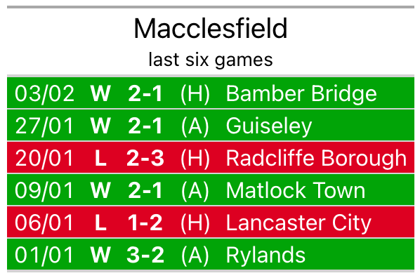 In their last league match, on February 3, Macclesfield beat Bamber Bridge 2-1 at home.