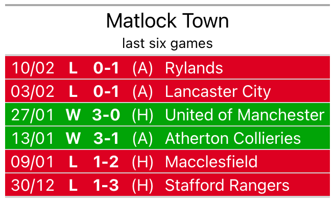 In their last league match, on February 10, Matlock lost to Rylands 1-0 away.