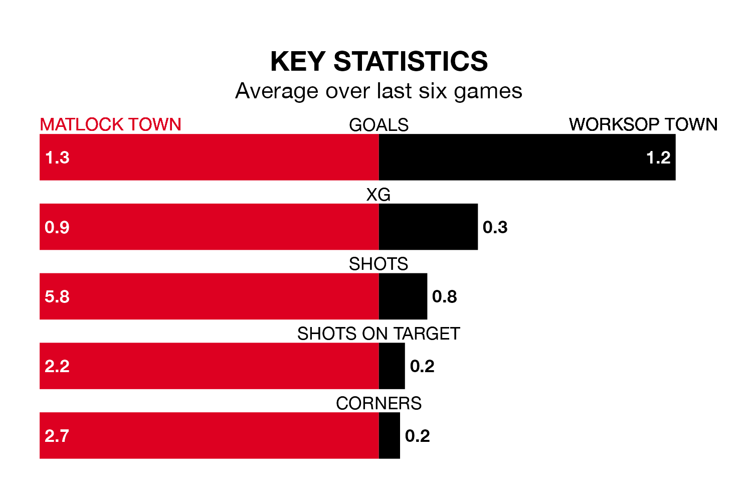 Matlock are also above average scorers, with 1.8 goals per game, compared to a league average of 1.7. They have also conceded 1.8 goals per game.
