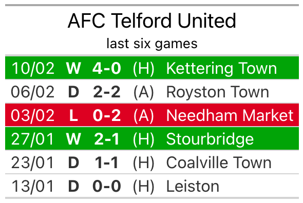 Telford United beat Stratford Town 3-0 last time out, also on Saturday.