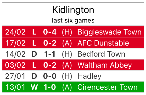 Kidlington lost 4-0 against Biggleswade Town last time out, on February 24.