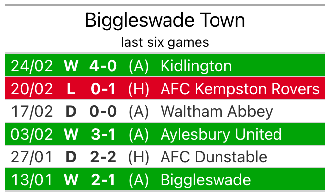 Biggleswade’s last match was on February 24, a 4-0 win against Kidlington.
