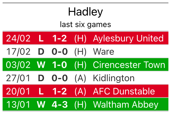 Hadley lost 2-1 against Aylesbury United last time out, also on February 24.