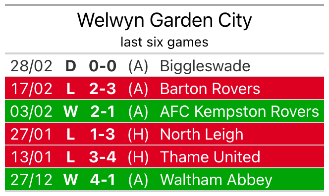 Welwyn Garden drew 0-0 with Biggleswade last time out, on Wednesday.