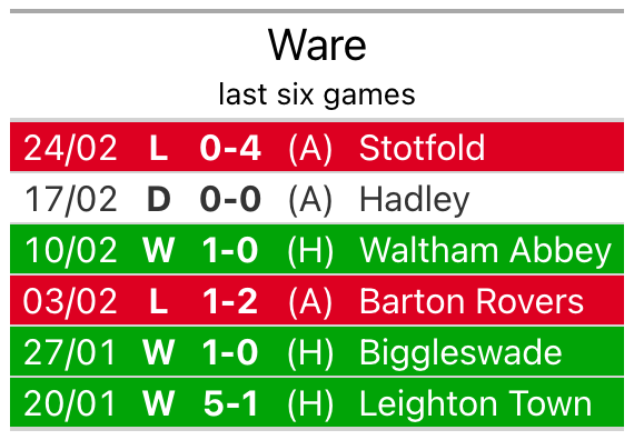 In their last league match, on February 24, Ware lost to Stotfold 4-0 away.