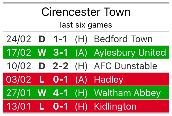 Cirencester are also above average scorers, with 1.8 goals per game, compared to a league average of 1.7. They have conceded 1.2 goals per game.