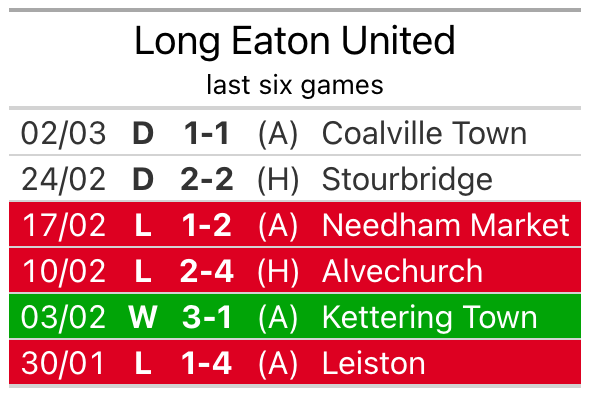 In their last league match, on Saturday, Long Eaton drew with Coalville Town 1-1 away.