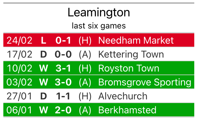 Leamington lost, 1-0 at home against Needham Market on February 24.