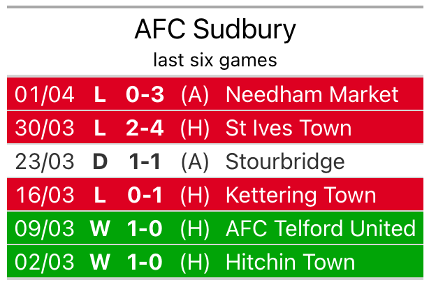 In their last league match, on Monday, Sudbury lost to Needham Market 3-0 away.