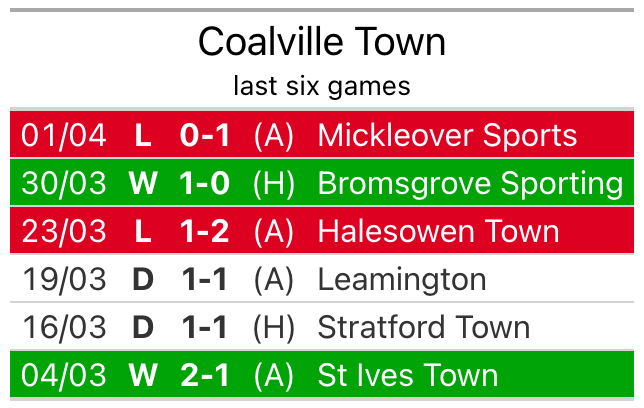 Coalville also lost, 1-0 away at Mickleover Sports.