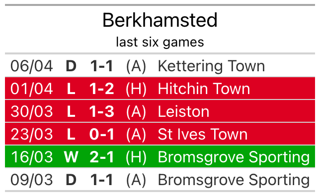 In their last league match, on April 6, Berkhamsted drew with Kettering Town 1-1 away.