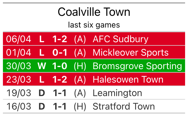In their last league match, on April 6, Coalville lost to AFC Sudbury 2-1 away.