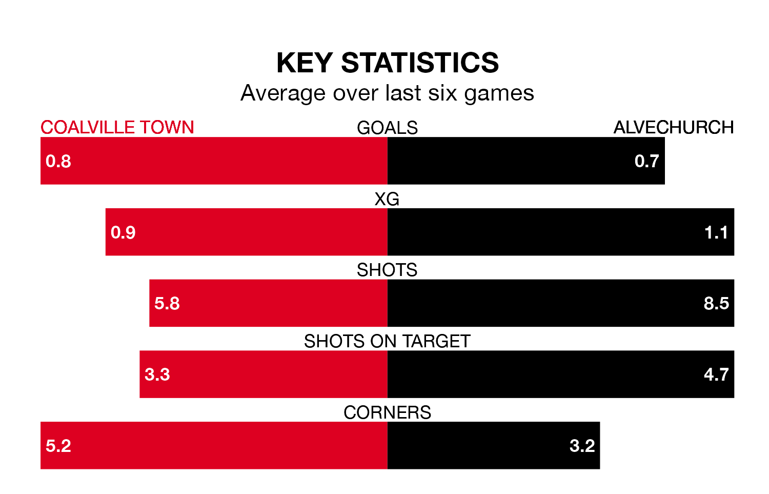 Alvechurch, meanwhile, are below average scorers, with 1.3 goals per game, compared to a league average of 1.5. They have conceded 1.7 goals per game.