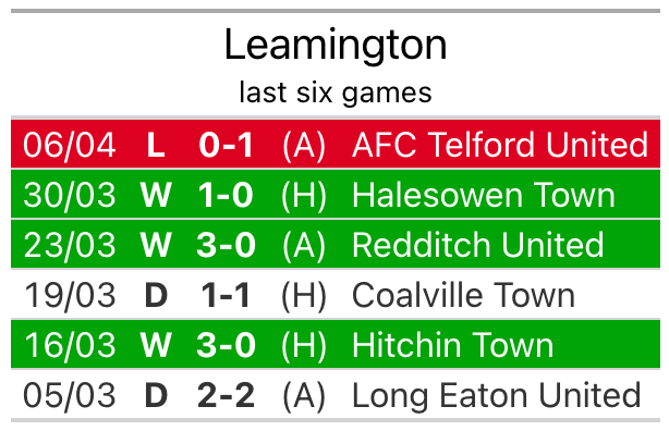 Leamington’s last match was on April 6, a 1-0 loss against AFC Telford United.