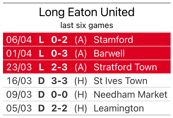 Long Eaton’s last match was on April 6, a 2-0 loss against Stamford.