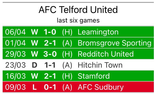 Telford United beat Leamington 1-0 last time out, also on April 6.